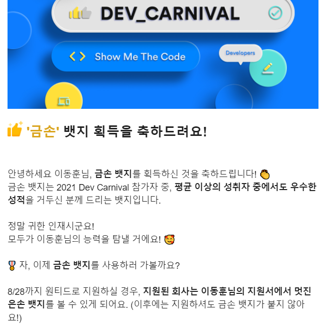 다행히 결과는 괜찮은 듯했다. 금손과 은손이라는 배지를 성적에 따라 부여했는데, 금손 배지를 받았다~!