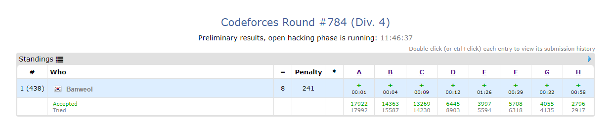 처음으로 문제를 다 풀었는데, 이번에 다 푼 참가자가 꽤 많다.. 1300명정도가 다 풀었는데 그 중에서 438등이면 꽤 빠르게 푼 것 같기도 하다.
