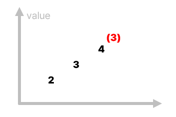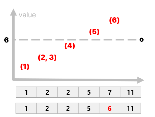 다음과 같이 주어진 수열 순서대로 배열을 채워나가던 도중에 새로운 값 6을 만났다고 하자. 빨간색 괄호는 부분 수열의 길이를 나타내고, 높낮이는 value를 나타낸다.