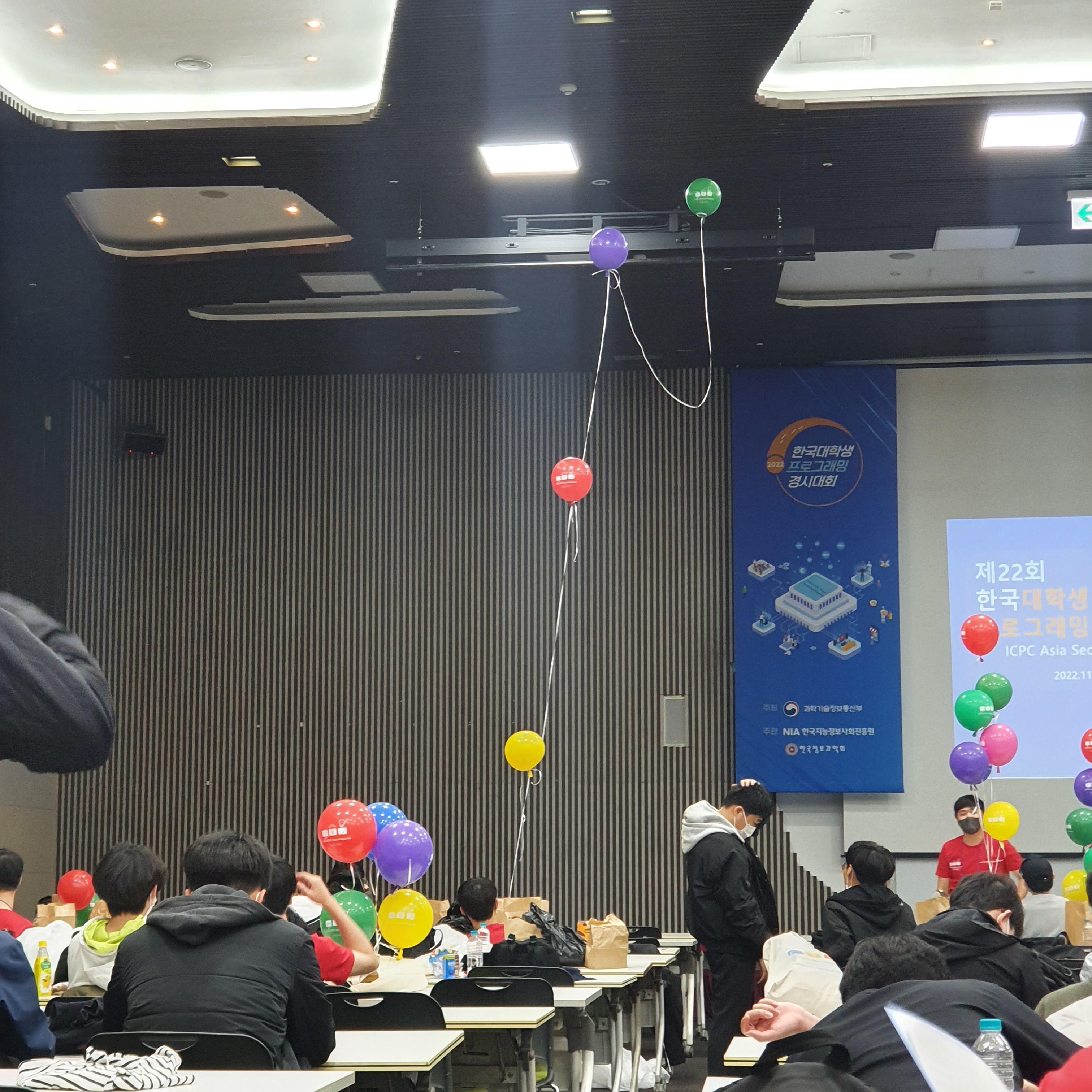 예선에서 한 문제도 못 풀었던 터라 꽤나 긴장을 많이 했고.. 교내 대회를 준비하느라고 리저널 준비를 꼼꼼하게 하지 못한 게 참 아쉽다. 그래도 진짜진짜 좋은 경험을 한 것 같아서 뿌듯해, 많은 사람들과 만나서(대화는 못 했지만..) 동기부여가 참 많이 됐다. 대단한 분들을 눈으로 뵀고, 풍선도 달고.