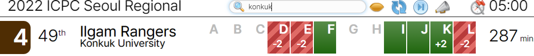 앉자마자 문제지를 세 부분으로 나눠가져서 읽었다. 나는 뒷부분을 집어들고 읽었고, 초반에 빠르게 J번이 풀리는 걸 보고 금방 구현해서 바로 AC. 파이썬으로 제출했다. 돌아와서 C++로 다시 제출했다가 틀렸는데, 답의 범위가 32비트 정수 범위를 초과하더라..